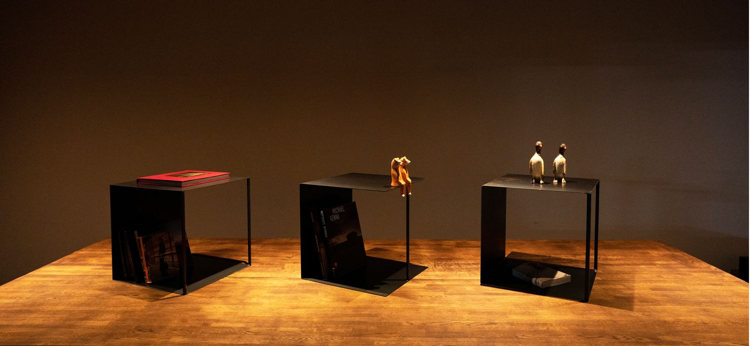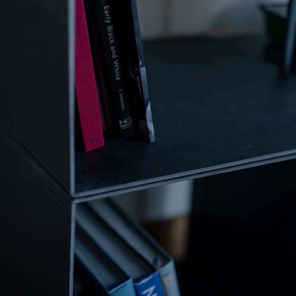 シンプルでありながら、黒皮鉄のマッドな色合いで本棚や小物を置くディスプレイに自由なアレンジをお楽しみいただけます。